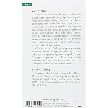 Vide et plein L'objet que se donne la peinture chinoise est de créer un microcosme, " plus vrai que la Nature elle-même " (Tsung Ping) : ceci ne s'obtient qu'en restituant les souffles vitaux qui animent l'Univers ; aussi le peintre cherche-t-il à capter les lignes internes des choses et à fixer les relations qu'elles entretiennent entre elles, d'où l'importance du trait. Mais ces lignes de force ne peuvent s'incarner que sur un fond qui est le Vide. Il faut donc réaliser le Vide sur la toile, entre les éléments et dans le trait même. C'est autour de ce Vide que s'organisent toutes les autres notions de la peinture chinoise ; celles-ci forment un système signifiant auquel François Cheng est le premier à appliquer une analyse sémiologique. Son commentaire est enrichi par d'amples citations et des reproductions.François Cheng Écrivain, il a été professeur à l'INALCO. Membre de l'Académie française, il est notamment l'auteur de Souffle-Esprit (Seuil, " Points Essais ", 2006) et de Cinq méditations sur la mort (Albin Michel, 2013).
